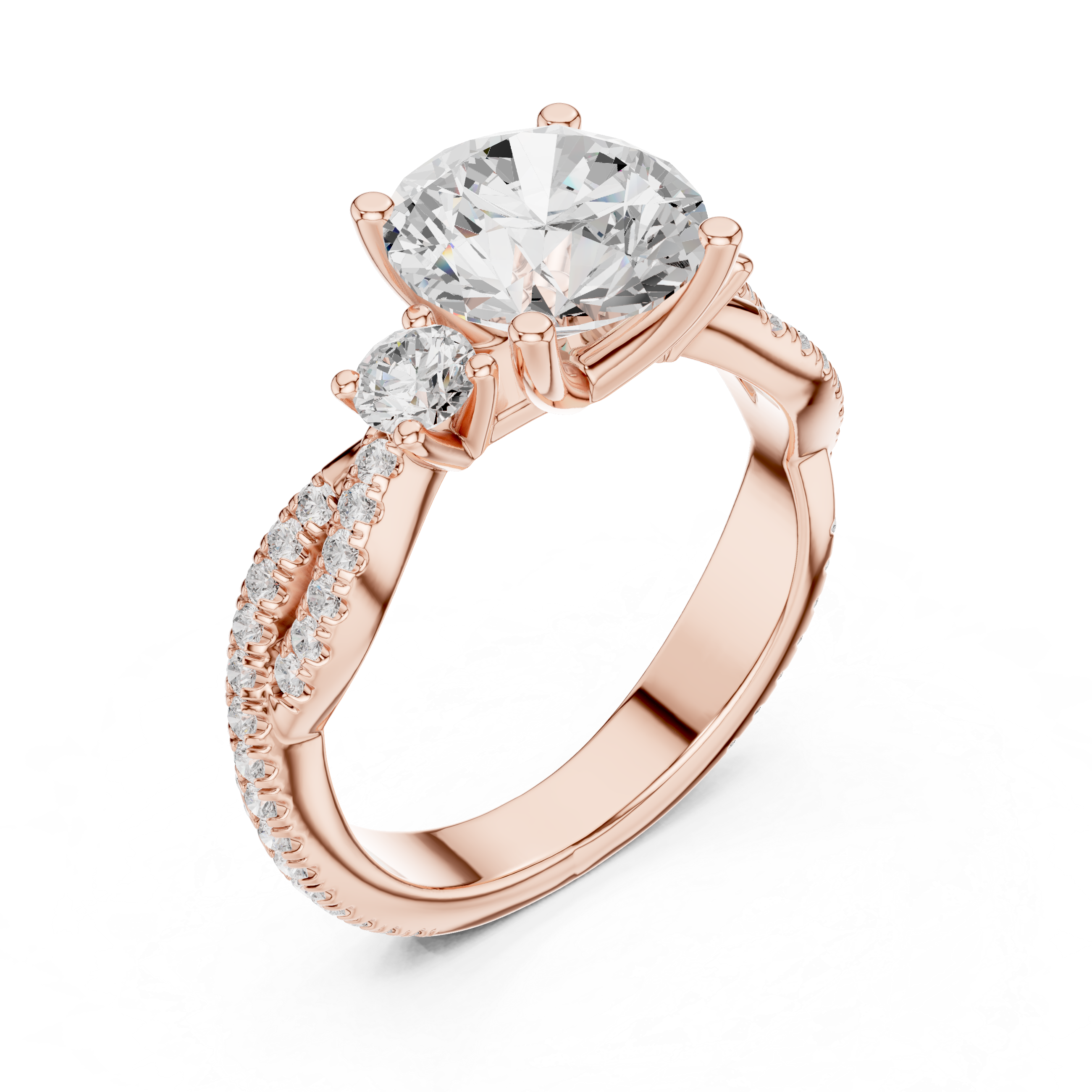 At the center is a commanding round brilliant Laboratory-grown Diamond of 2.00 carats, elevated gracefully to maximize light and brilliance. It is flanked by two round side Laboratory-grown Diamonds that add depth and balance, while the band is adorned with a refined row of 56 micro-set, creating a continuous shimmer that feels subtle yet unmistakably luxurious.