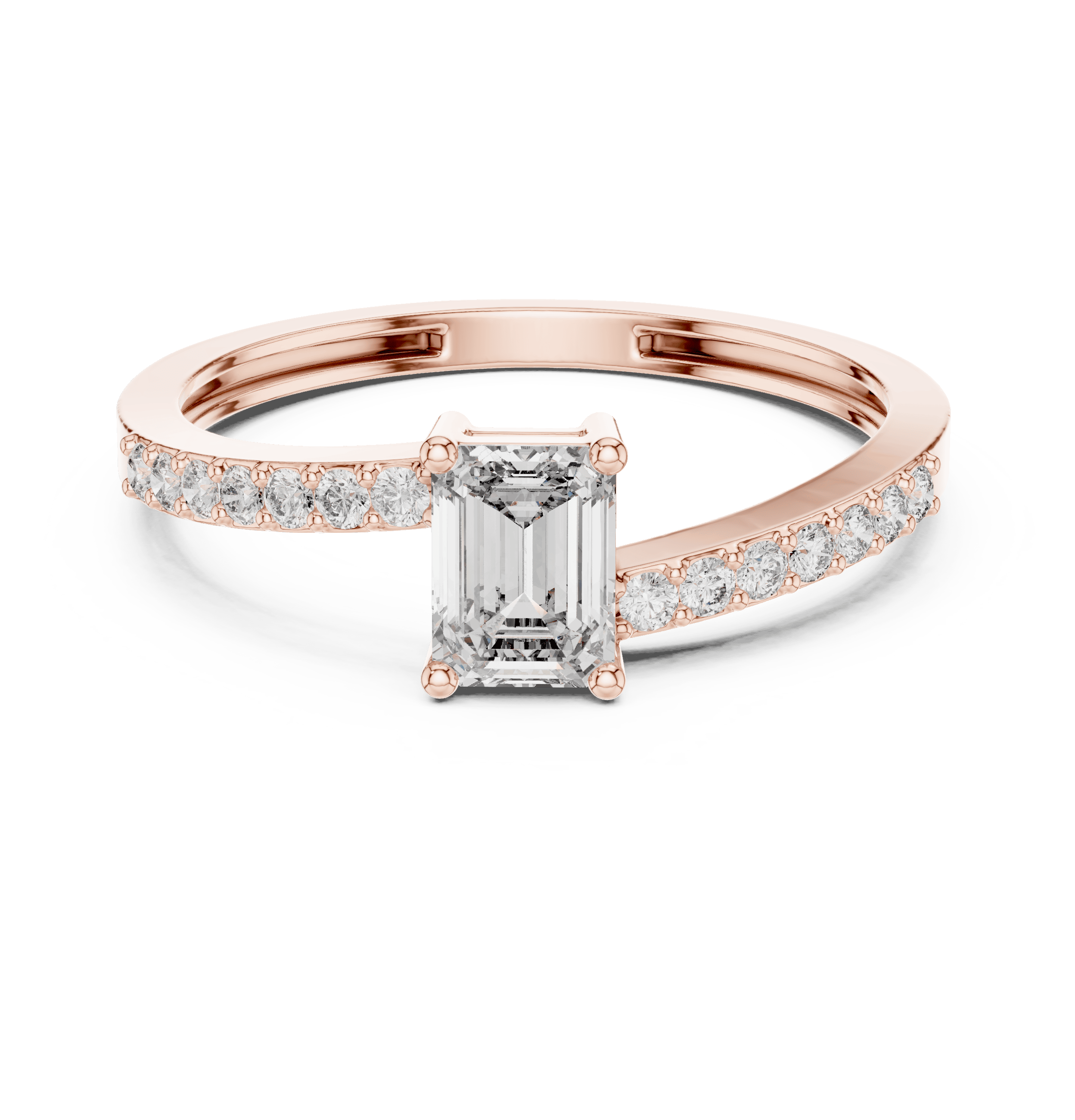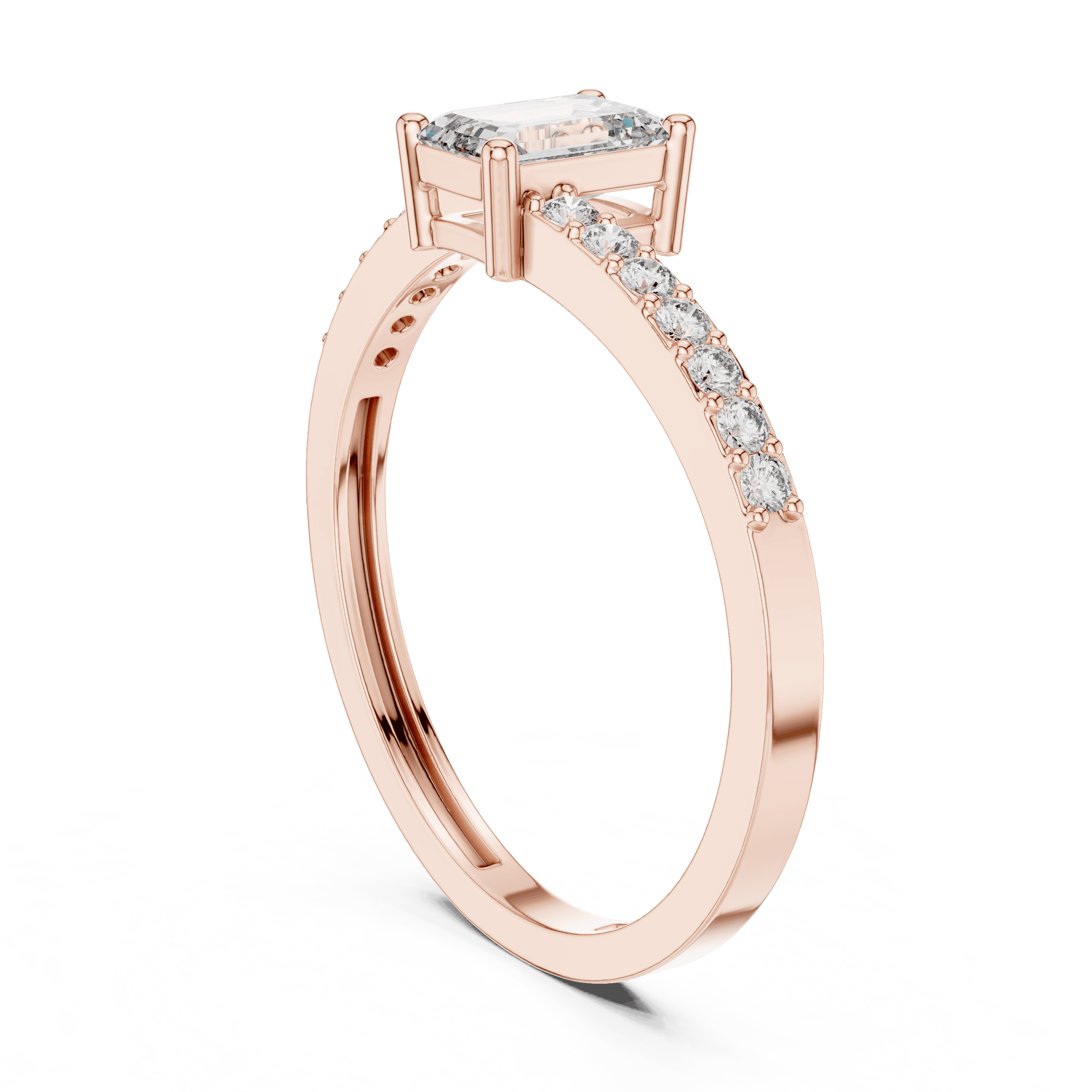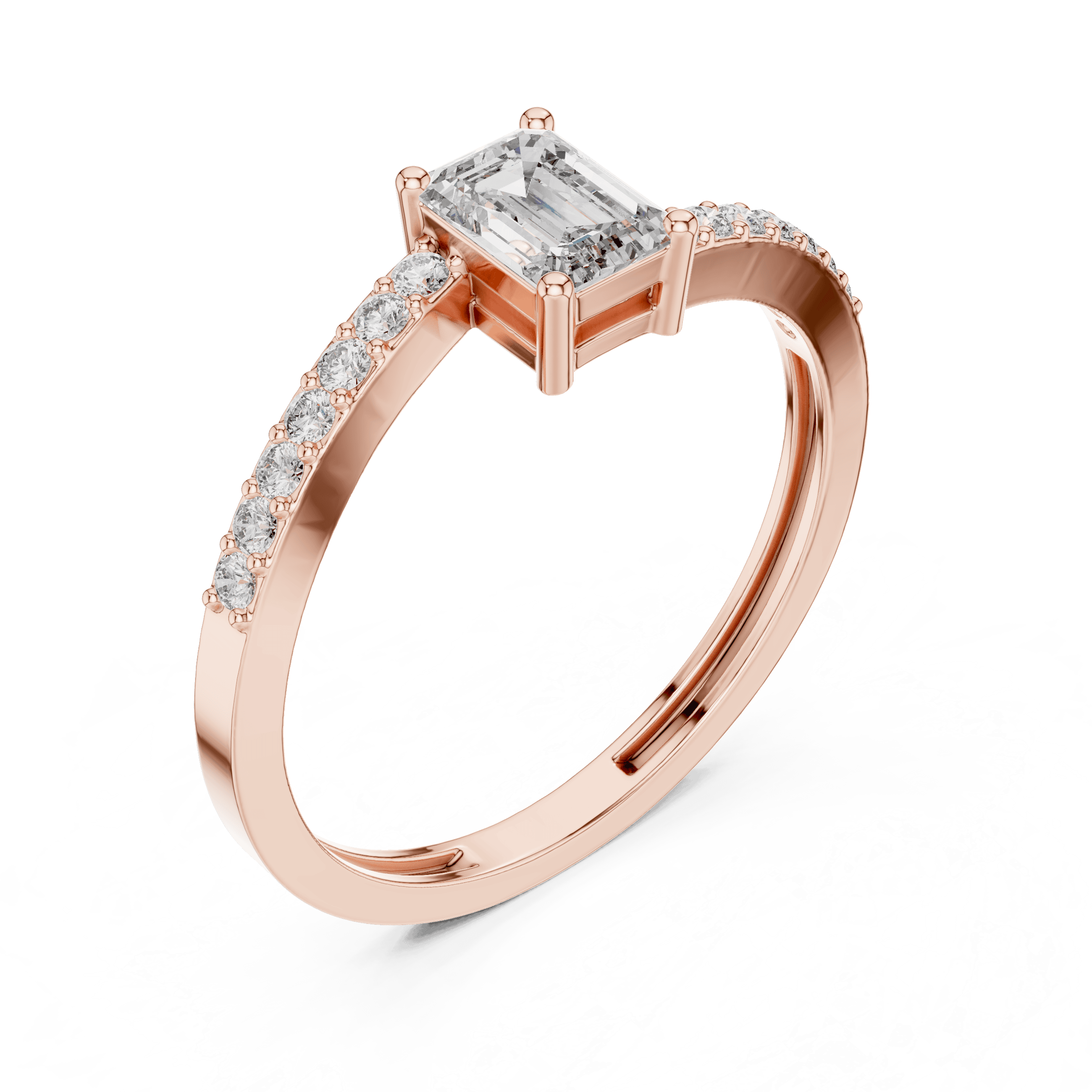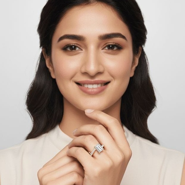 Virelle is a refined expression of contemporary elegance, designed for those who appreciate quiet confidence and timeless design. At its heart sits a striking emerald-cut laboratory grown diamond measuring 5.50 × 4.00 mm, weighing 0.50 carat, chosen for its clean geometry and mirror-like brilliance that reflects light with understated sophistication. This center stone is elevated by a delicate arrangement of fourteen round brilliant laboratory grown diamonds, each measuring approximately 1.30 mm, together contributing an additional 0.14 carat. These round diamonds are prong-set along the shoulders, creating a soft, continuous shimmer that enhances the central emerald silhouette without overpowering it.