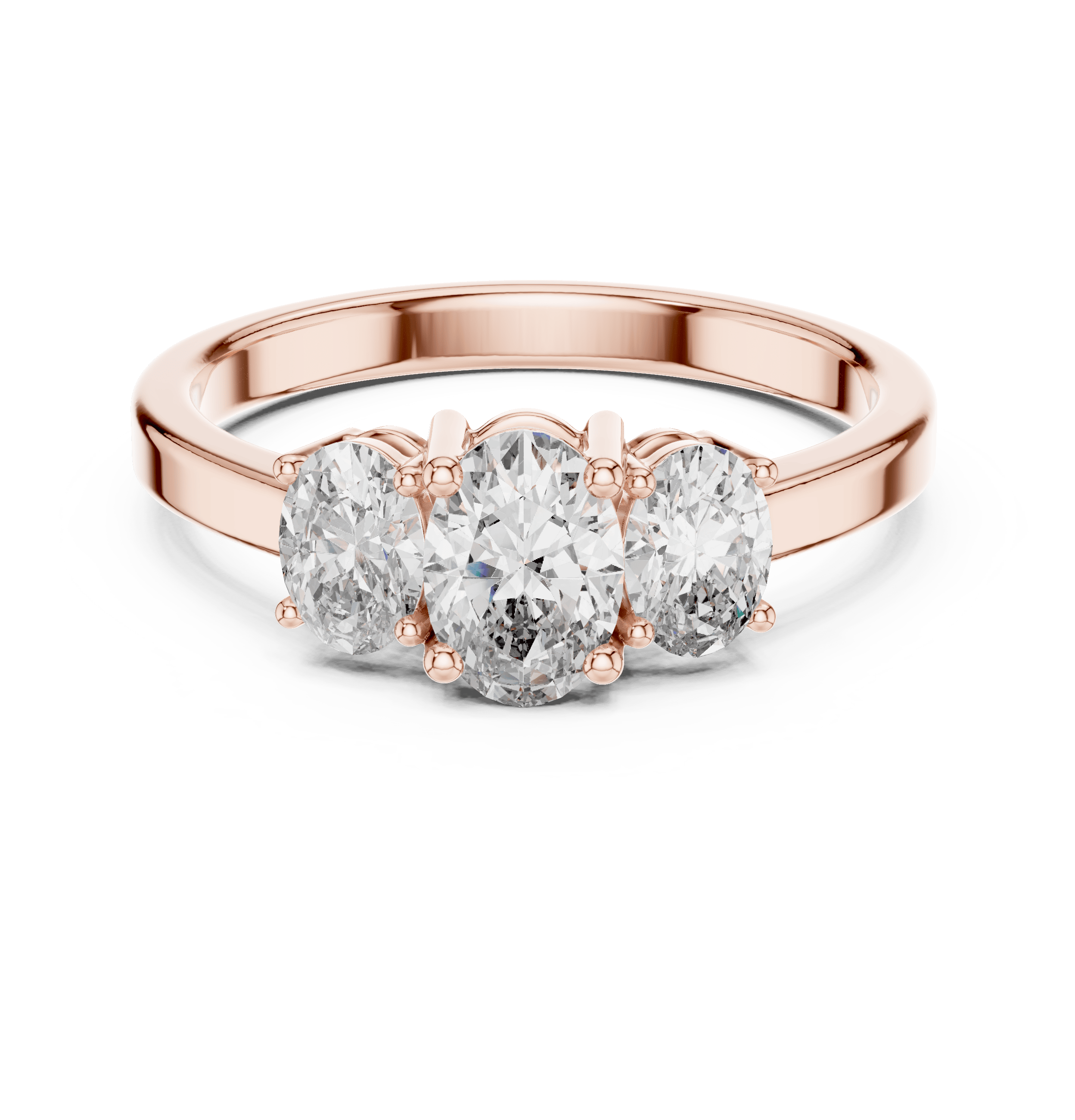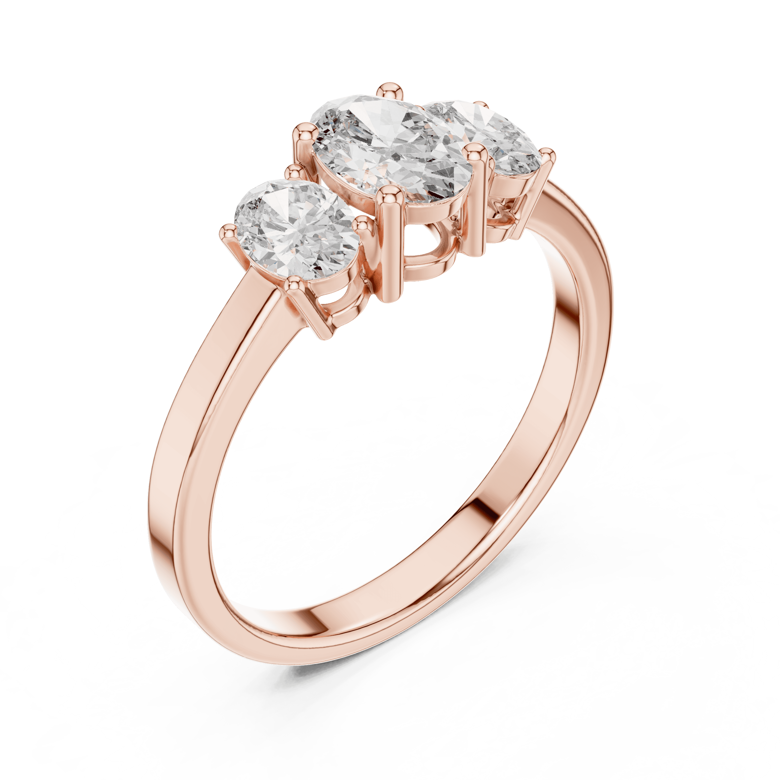 As per the CAD design, the ring is set with three laboratory grown diamonds arranged in a refined linear silhouette. The center stone is a striking oval laboratory grown diamond measuring 6.50 × 4.50 mm with a diamond weight of 0.50 carat, flanked by two oval laboratory grown diamonds measuring 5.00 × 3.50 mm each, weighing 0.225 carat per stone. The total diamond weight comes to 0.95 carat, with all diamonds securely held in a collet setting that enhances brilliance while maintaining a smooth, modern profile and long-term durability.