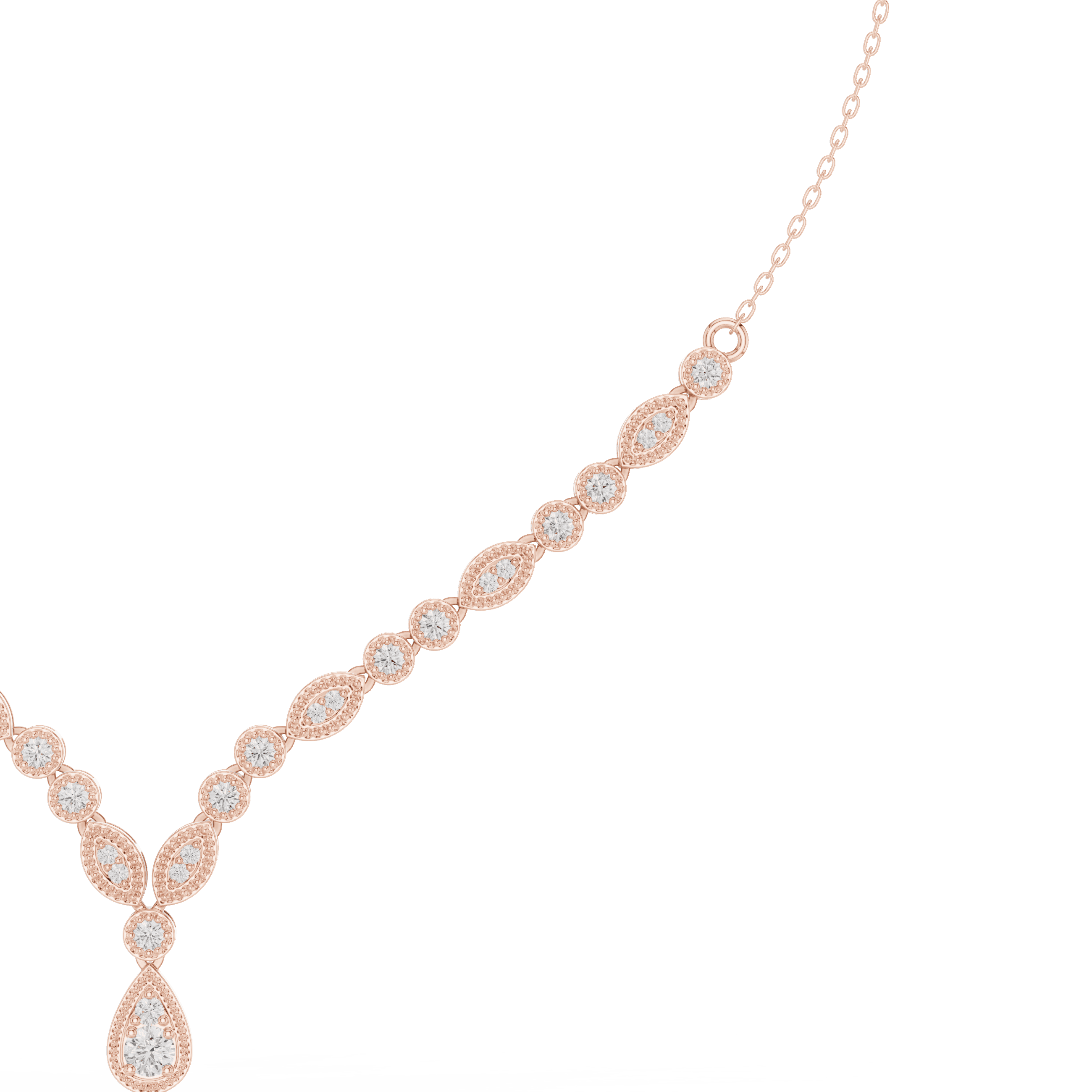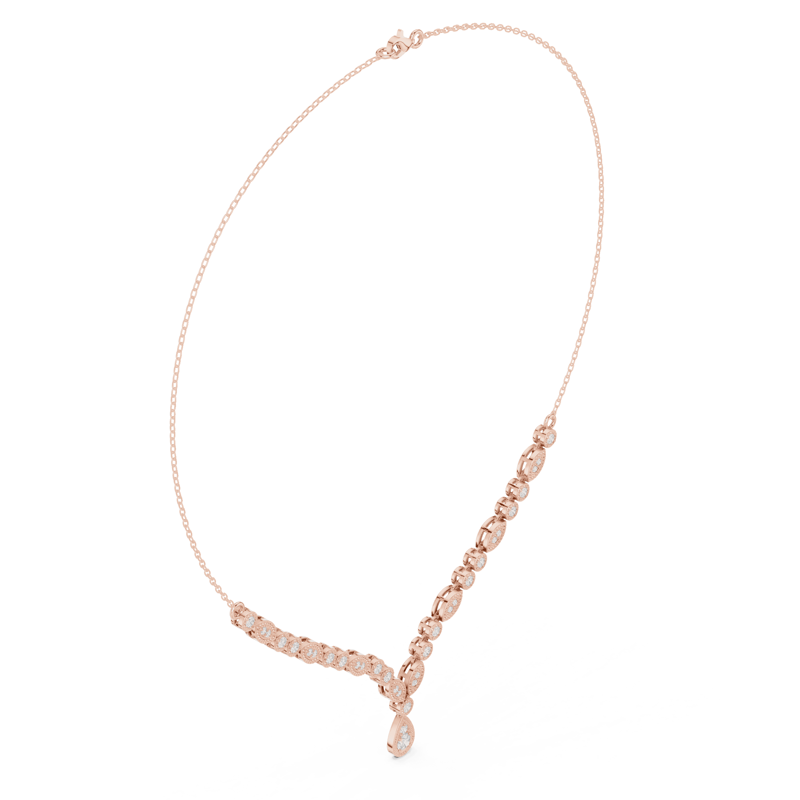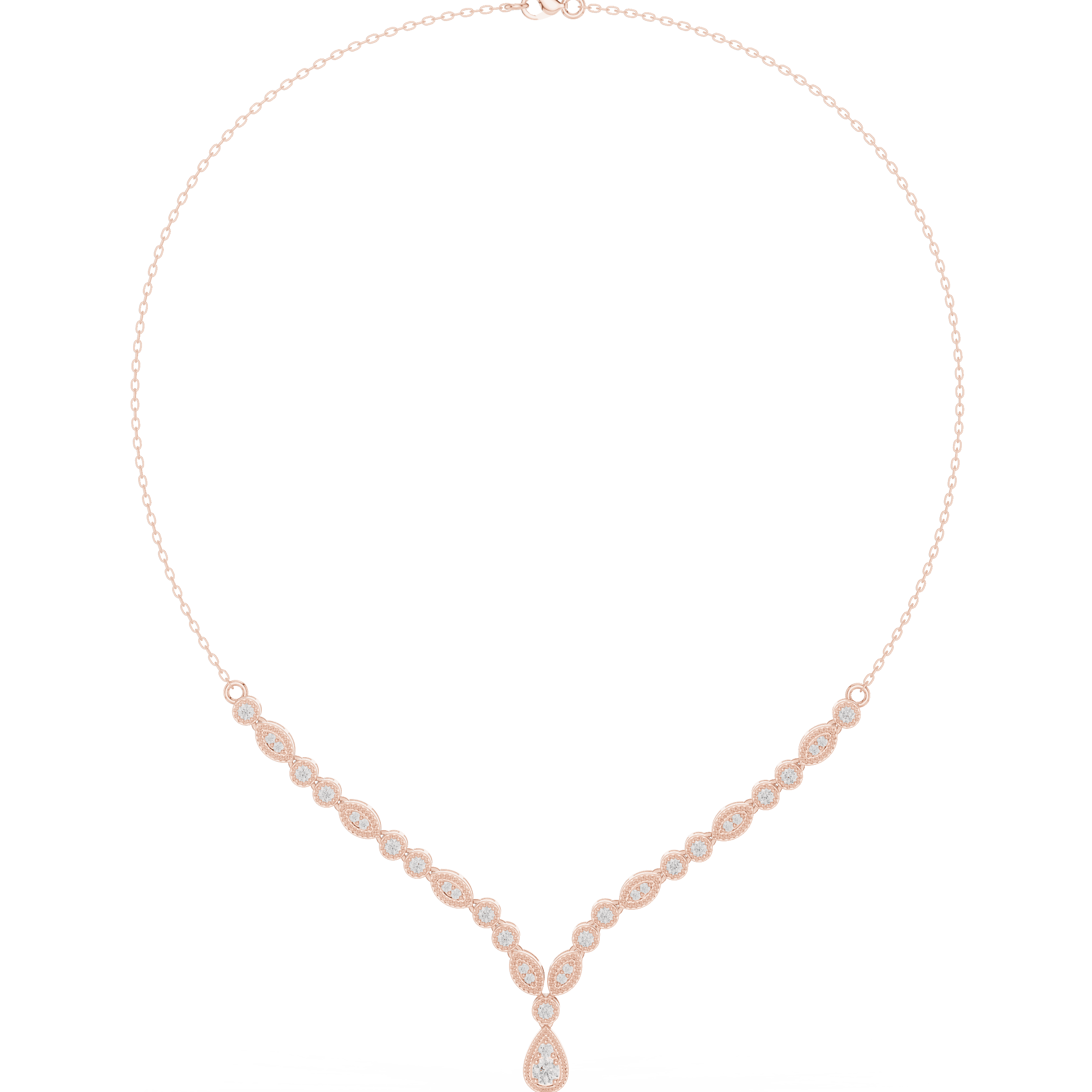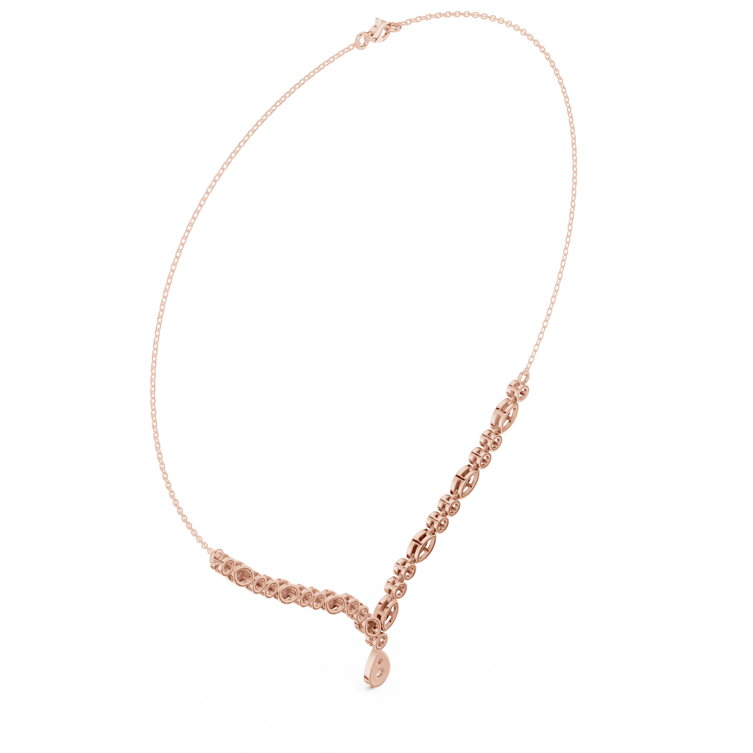 The design is set with laboratory grown diamonds arranged in precise prong settings for controlled brilliance. As per CAD specifications, the necklace features 33 round laboratory grown diamonds: 15 stones of 2.30 mm (0.750 ct), 16 stones of 1.40 mm (0.192 ct), one 3.50 mm stone (0.165 ct), and one 2.00 mm stone (0.035 ct), resulting in a total laboratory grown diamond weight of approximately 1.142 carats.